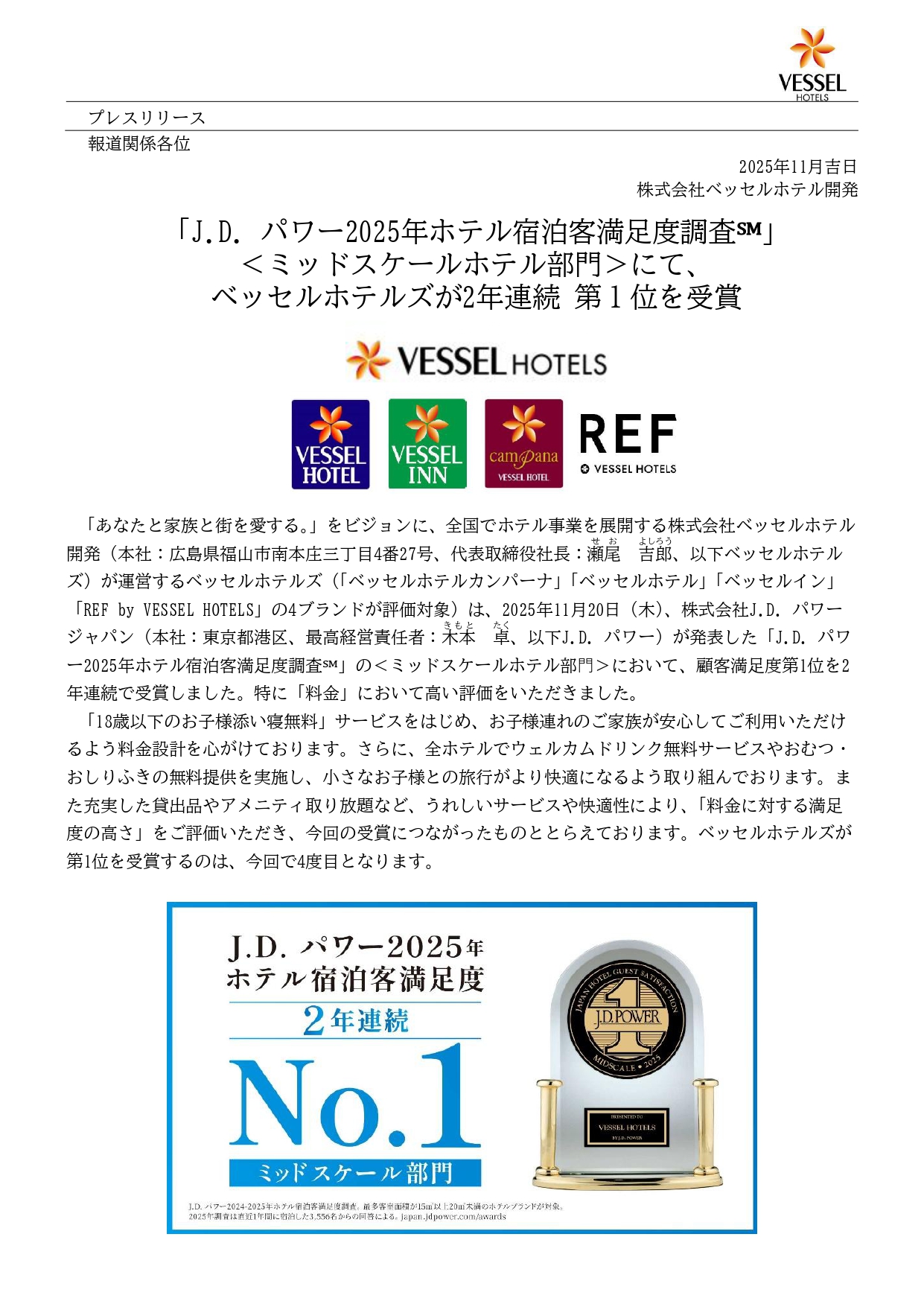 【2025年11月】「J.D. パワー2025年ホテル宿泊客満足度調査℠」<ミッドスケール部門>にて、ベッセルホテルズが2年連続 第1位を受賞 投稿日: 2025.11.28 投稿者: Vessel-staff PRESS RELEASE 一覧に戻る 【2025年11月】「J.D. パワー2025年ホテル宿泊客満足度調査℠」<ミッドスケール部門>にて、ベッセルホテルズが2年連続 第1位を受賞 PDFをダウンロード
