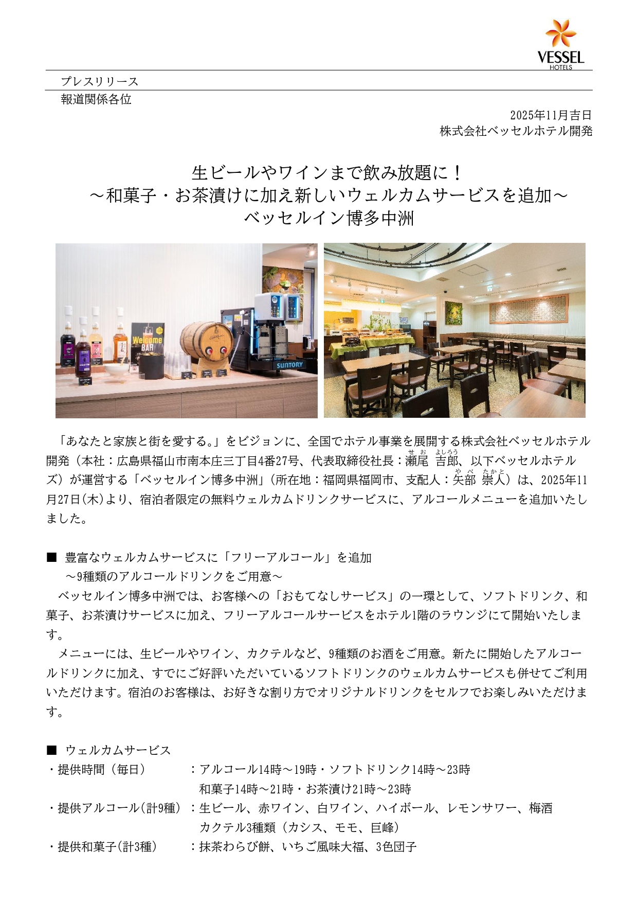 【2025年11月】ベッセルイン博多中洲 フリーアルコールサービス開始 投稿日: 2025.11.28 (2025.11.28) 投稿者: Vessel-staff PRESS RELEASE 一覧に戻る 【2025年11月】ベッセルイン博多中洲 フリーアルコールサービス開始 PDFをダウンロード