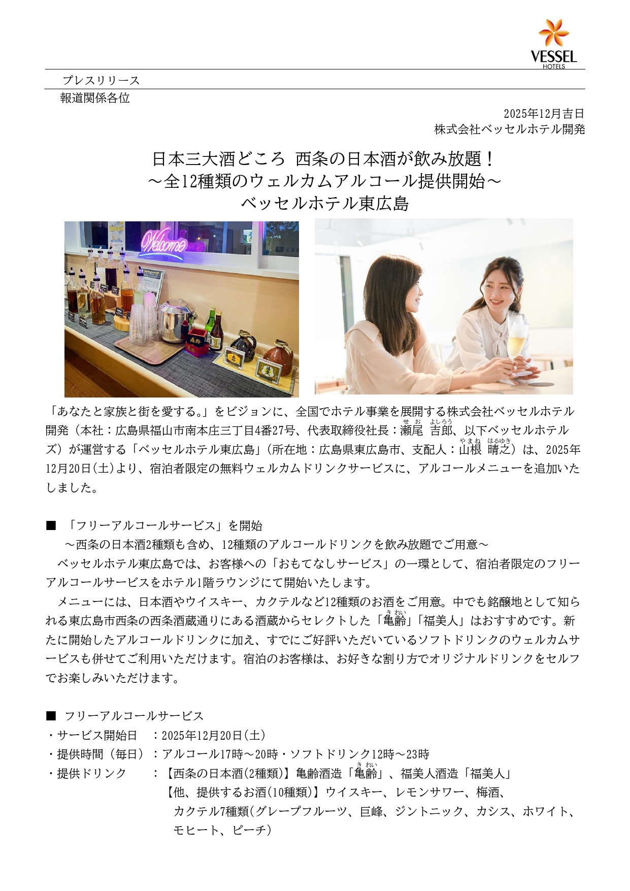【2025年12月】日本三大酒どころ 西条の日本酒が飲み放題!~全12種類のウェルカムアルコール提供開始~|ベッセルホテル東広島 投稿日: 2026.01.10 (2026.01.10) 投稿者: Vessel-staff PRESS RELEASE 一覧に戻る 【2025年12月】日本三大酒どころ 西条の日本酒が飲み放題!~全12種類のウェルカムアルコール提供開始~|ベッセルホテル東広島 PDFをダウンロード