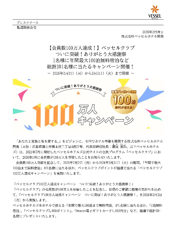 【2025年1月】\会員数100万人達成!/ベッセルクラブ ついに突破!ありがとう大感謝祭 キャンペーン開催|ベッセルホテルズ 投稿日: 2026.02.02 投稿者: Vessel-staff PRESS RELEASE 一覧に戻る 【2025年1月】\会員数100万人達成!/ベッセルクラブ ついに突破!ありがとう大感謝祭 キャンペーン開催|ベッセルホテルズ PDFをダウンロード
