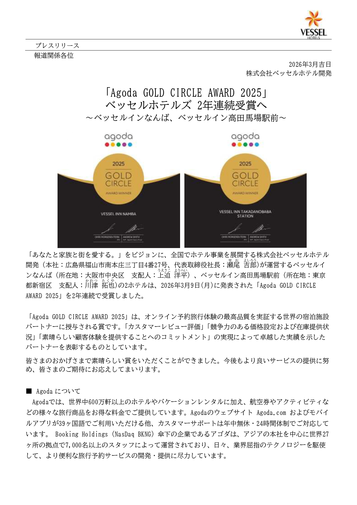 【2026年3月】「Agoda GOLD CIRCLE AWARD 2025」ベッセルホテルズ2年連続受賞へ~ベッセルインなんば、ベッセルイン高田馬場駅前~ 投稿日: 2026.03.20 (2026.04.28) 投稿者: Vessel-staff PRESS RELEASE 一覧に戻る 【2026年3月】「Agoda GOLD CIRCLE AWARD 2025」ベッセルホテルズ2年連続受賞へ~ベッセルインなんば、ベッセルイン高田馬場駅前~ PDFをダウンロード