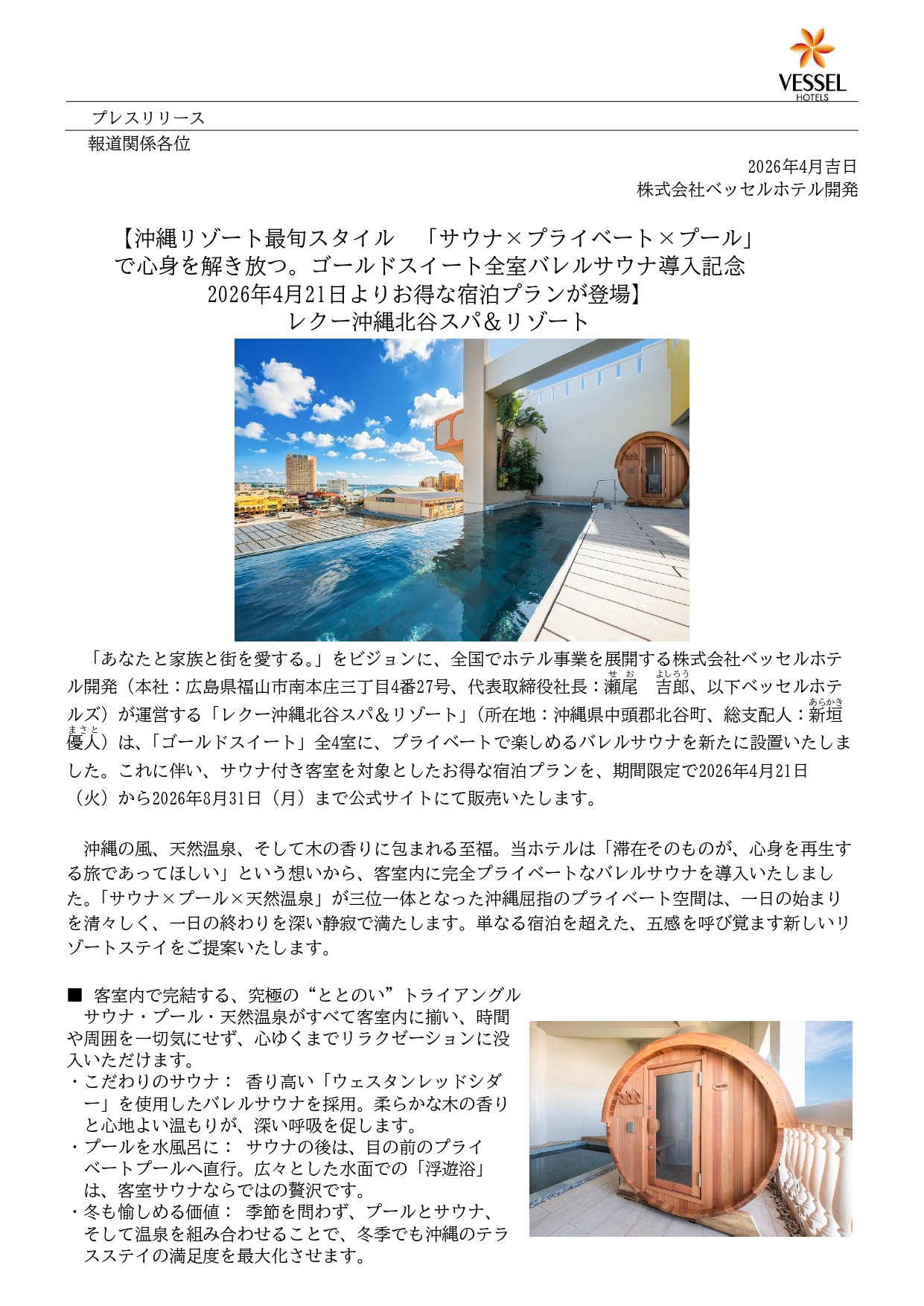 【2026年4月】ゴールドスイート全4室にバレルサウナ導入|レクー沖縄北谷 スパ&リゾート 投稿日: 2026.04.22 (2026.04.28) 投稿者: Vessel-staff PRESS RELEASE 一覧に戻る 【2026年4月】ゴールドスイート全4室にバレルサウナ導入|レクー沖縄北谷 スパ&リゾート PDFをダウンロード
