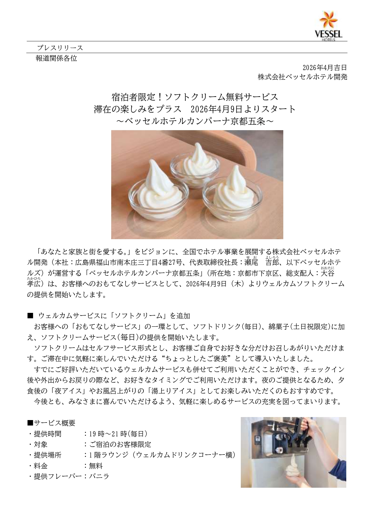 【2026年4月】宿泊者限定!ソフトクリーム無料サービス 2026年4月9日(木)スタート|ベッセルホテルカンパーナ京都五条