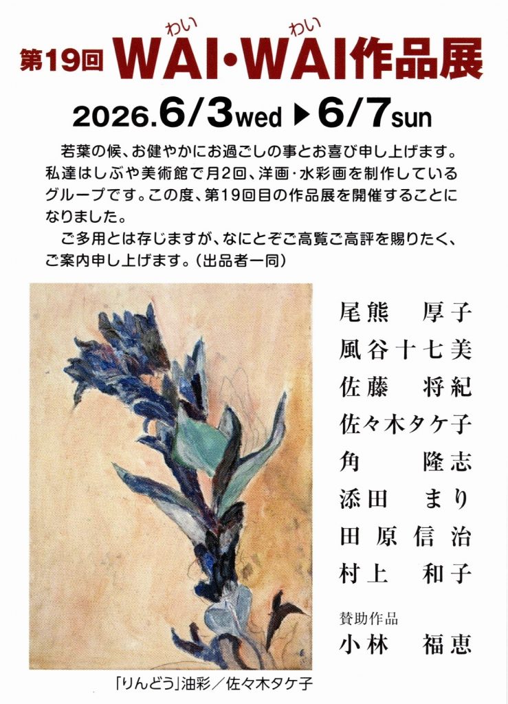 第19回WAI・WAI作品展 2026.06.03[水] ― 2026.06.07[日]貸館展覧会(本館) 小林福惠絵画教室の生徒作品展。 油彩、水彩など、個性豊かな力作を展示します。 入場無料です。 ―――――――――――――――――――――――― 会期/2026年 6月3日(水)~7日(日) 時間/9:30~17:00(入館は16:30まで) ※最終日は15:30終了(入館は15:00まで) ――――――――――――――――――――――――