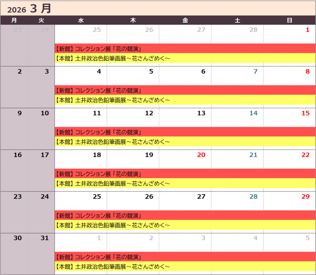 3月の休館日や時間変更のおしらせ 2026.02.21 2026年3月の休館日や時間変更のおしらせ カレンダーの下に詳しい内容を記載しています。 ⬛️3月は臨時休館、閉館時間変更はありません。 ※諸事情により、急な変更が発生する場合があります。あらかじめご了承ください。 ―――――――――――――――――――――――――――― ⬛️通常の休館日と開館時間は以下のとおりです 休 館 日 :月・火曜日(祝日の場合も含みます)、夏期・年末年始 開館時間:9:30~17:00(入館は16:30まで)