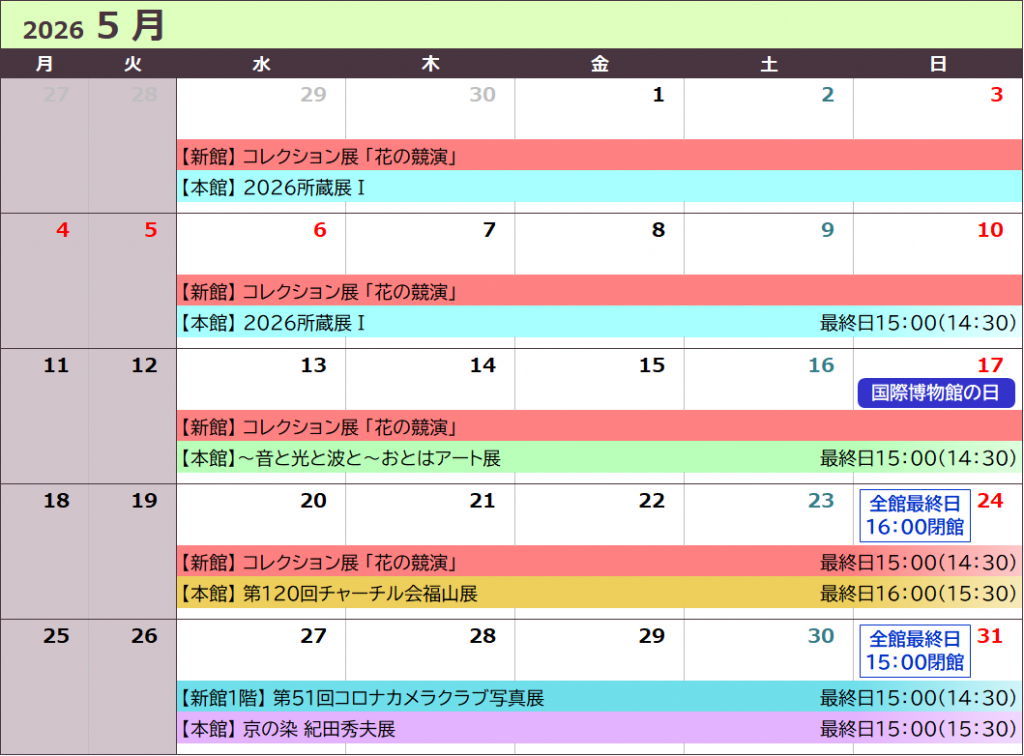 5/24(日) ・・・新館15:00 閉館 (入場は14:30まで)本館(全館)16:00 閉館 (入館は15:30まで)